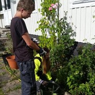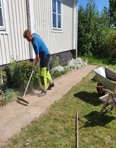 Sköta rabatter, rensa ogräs, plantera nytt, beskära äppelträd mm, och välförtjänt rast.